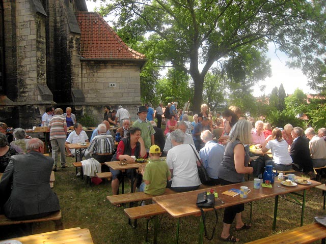 Obwohl Ruhetag, war auch am Sonntag für Programm gesorgt. Am frühen Nachmittag fand in der Kirche in Groß Steinum ein Gottesdienst statt, dem in angenehmer Atmosphäre ein Kaffee- und Kuchen-Treffen auf dem Kirchgelände folgte.